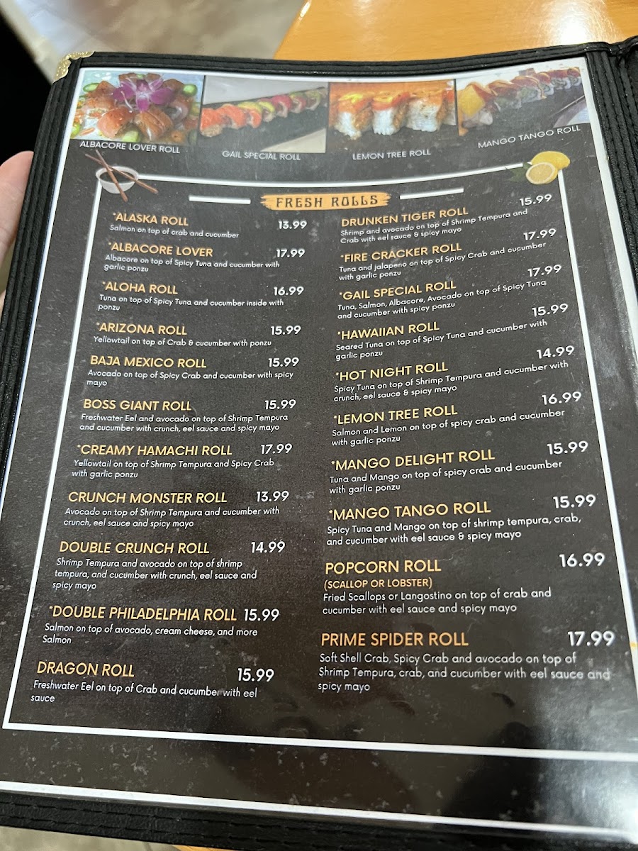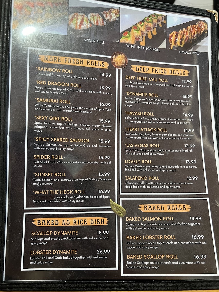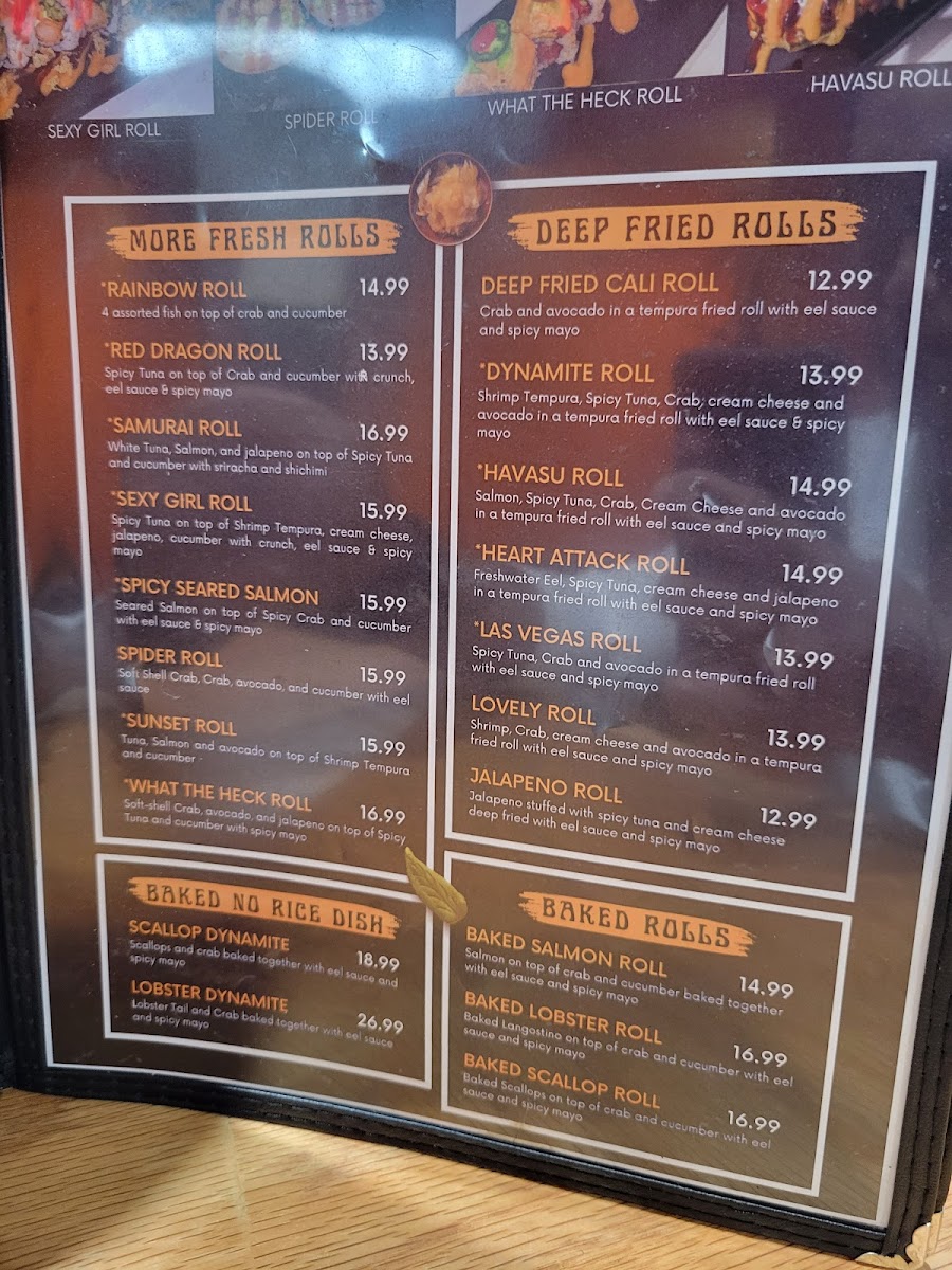 In: fried shrimp, spicy tuna, cream cheese, avocado, crab, sauce, eel, spicy mayo.