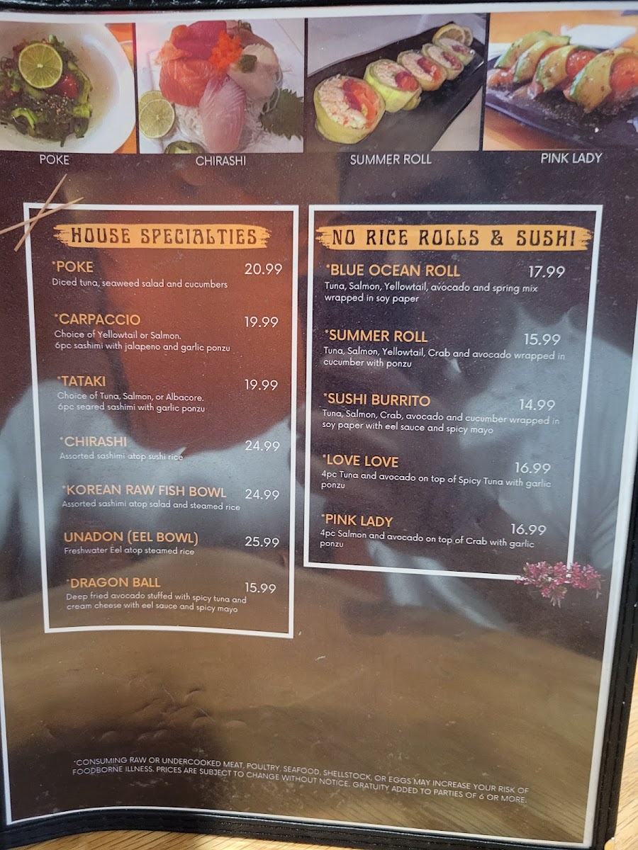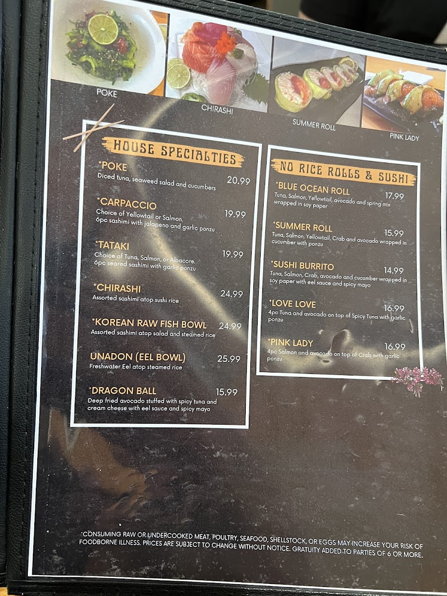 Yellowtail or salmon top with jalapeño and specialty. *Included raw fish "Thoroughly cooking foods of animal origin such as beef, eggs, fish, lamb, milk, poultry or shellfish reduces the risk of foodborne illness. Individuals with certain health conditions may be at higher risk if these foods are consumed raw or undercooked."